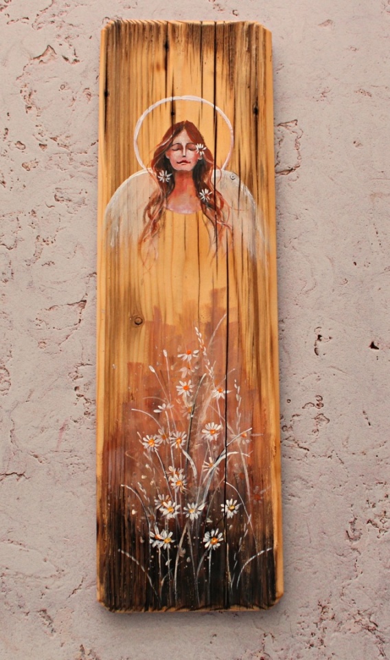 Deski, na których malowane są anioły to wyjątkowe drewno: nadszarpnięte duchem czasu, zdarzają się takie z pęknięciami, zadrapaniami, śladami korytarzy wyrytych przez jego byłych owadzich mieszkańców;). To atut, zaleta! Taka deska to prezent dla miłośników rzeczy z duszą i historią.