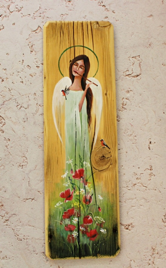 Deski, na których malowane są anioły to wyjątkowe drewno: nadszarpnięte duchem czasu, zdarzają się takie z pęknięciami, zadrapaniami, śladami korytarzy wyrytych przez jego byłych owadzich mieszkańców;). To atut, zaleta! Taka deska to prezent dla miłośników rzeczy z duszą i historią.